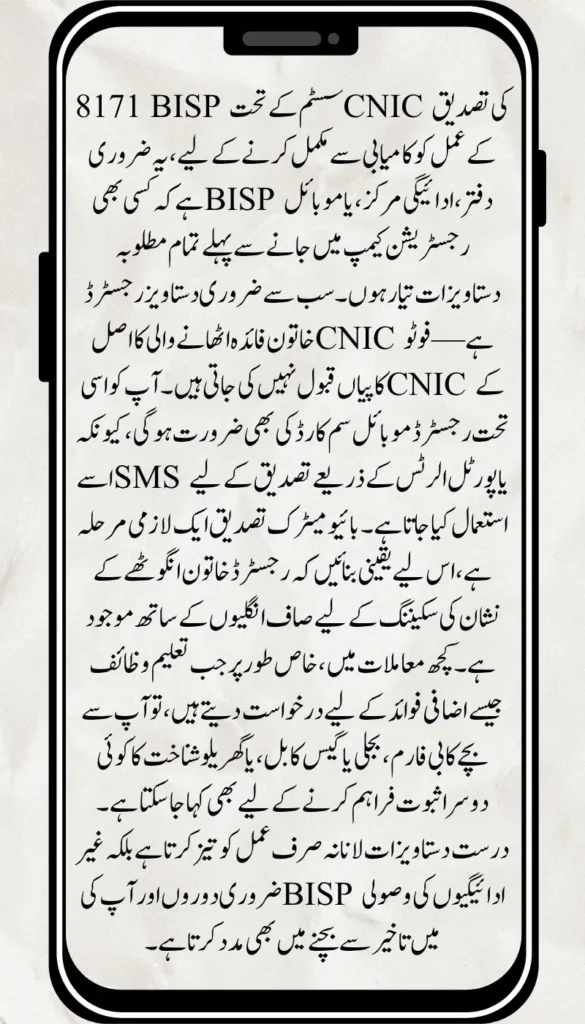 To successfully complete the CNIC verification process under the 8171 BISP system, it’s important to have all the required documents ready before visiting any BISP office, payment center, or mobile registration camp. The most essential document is the original CNIC of the registered female beneficiary—photocopies are not accepted. You’ll also need the mobile SIM card registered under the same CNIC, as it’s used for verification through SMS or portal alerts.