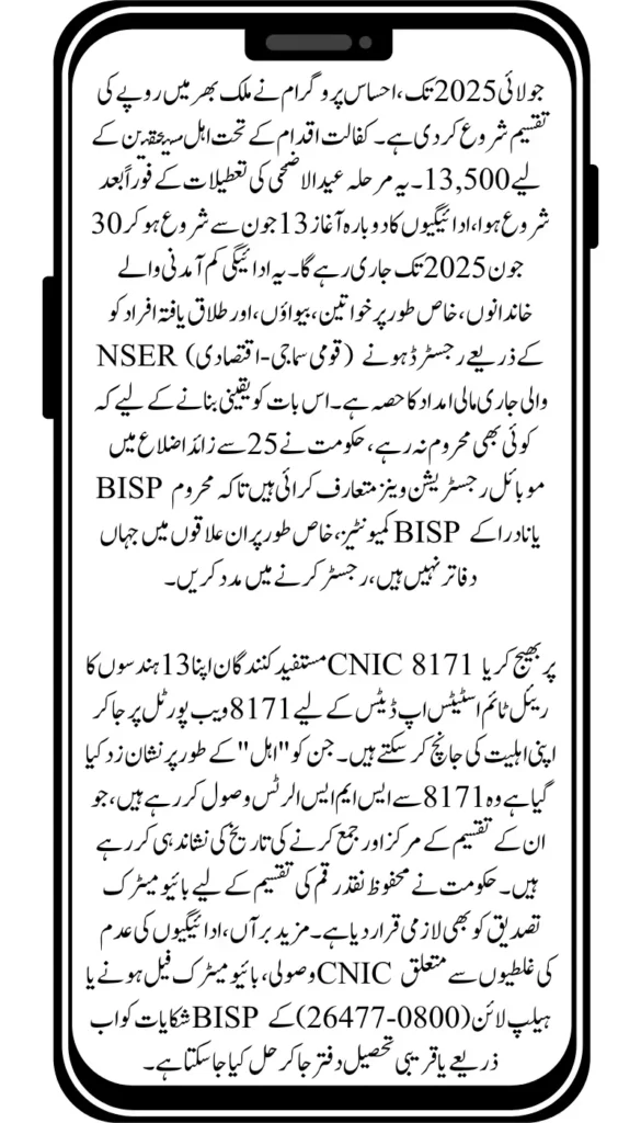 According to the latest announcement by government authorities, the distribution of the 13,500 rupees installment has officially started. Eligible families who have already registered under the 8171 Ehsaas Program can now receive their payments either through designated centers or directly into their bank accounts.