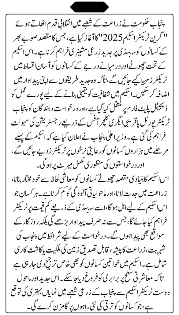 The Green Tractor Scheme is not just a one-time project but part of the Punjab government’s larger vision to modernize agriculture and improve rural livelihoods. In the coming years, similar schemes will be launched to provide solar irrigation systems, smart seeders, and precision farming tools.