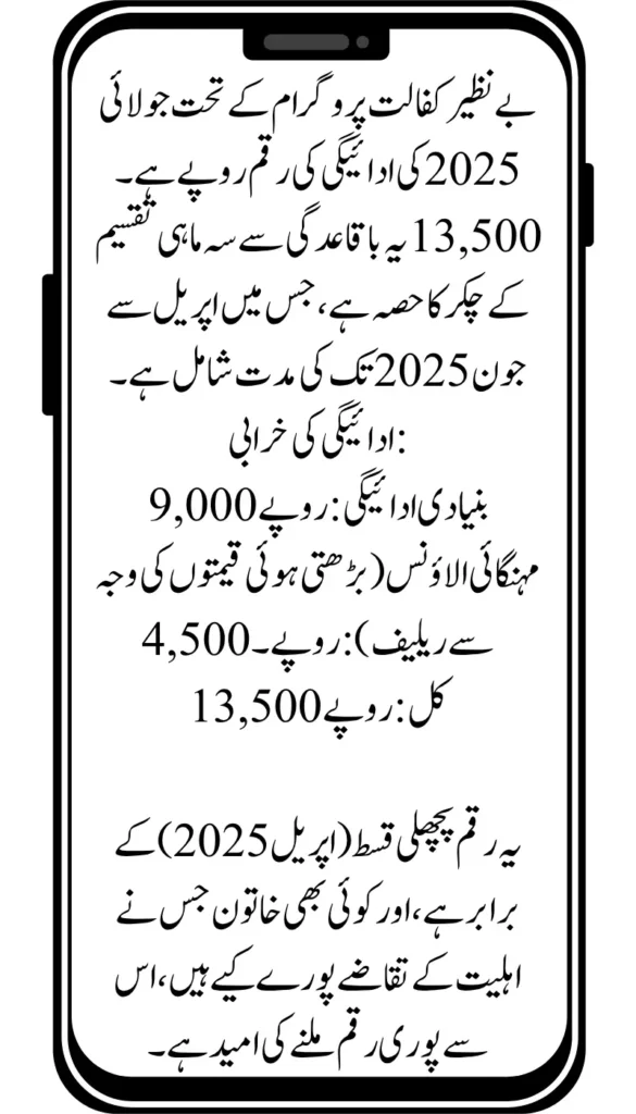 The payment amount for July 2025 under the Benazir Kafalat Program is Rs. 13,500. This is part of the regular quarterly disbursement cycle, covering the period from April to June 2025.