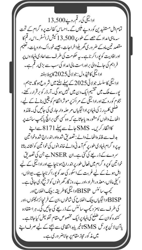 The July 2025 payments under the BISP 8171 program will begin in the first week of July. However, payments will be made district-wise in phases, so your payment date may vary depending on your area.