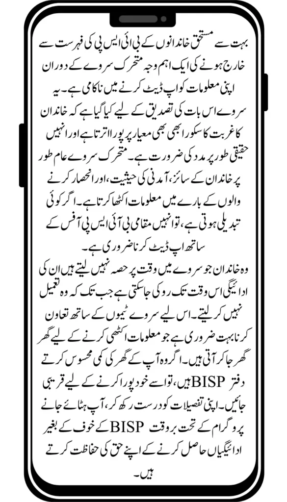 Families that do not participate in the survey on time may find their payments stopped until they comply. Therefore, it is very important to cooperate with survey teams who visit door to door to collect information. If they miss your household, visit the nearest BISP office to complete it yourself. By keeping your details accurate, you protect your right to get timely payments under the BISP program without fear of removal.