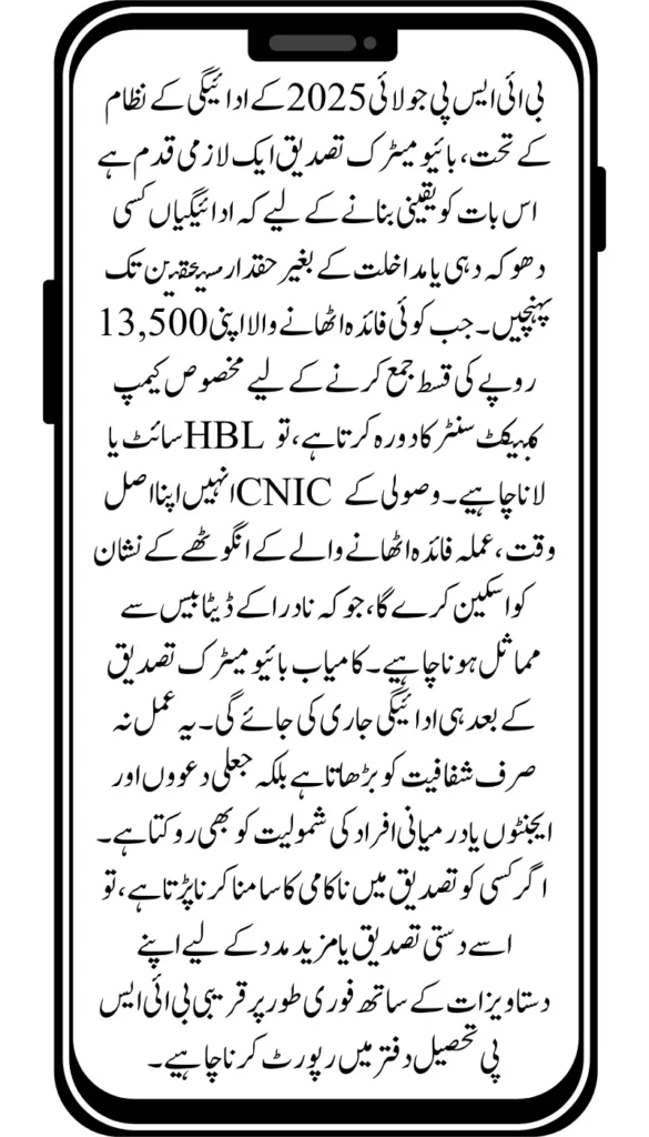 Under the BISP July 2025 payment system, biometric verification is a mandatory step to ensure that payments reach the rightful beneficiaries without any fraud or interference. When a beneficiary visits the designated campsite or HBL Konnect center to collect their Rs 13,500 installment, they must bring their original CNIC. At the time of collection, the staff will scan the beneficiary’s thumbprint, which must match the NADRA database.