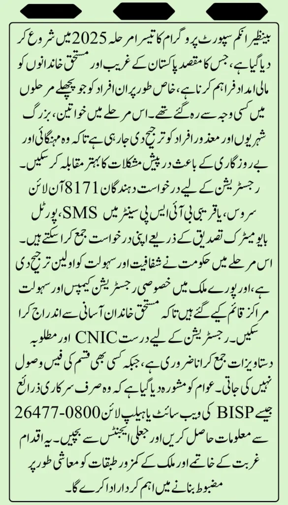 BISP Phase 3 is the third round of registrations under the Benazir Social Income Program, launched in 2025 to provide financial support to low-income and deserving families across Pakistan.