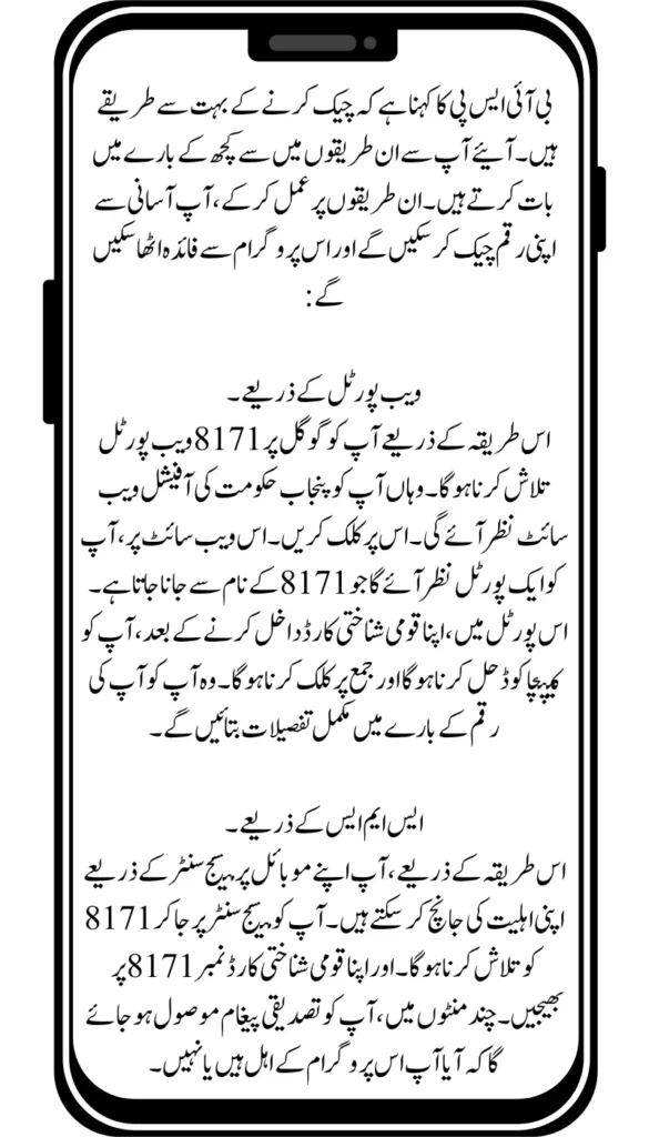 Through this method, you have to search the 8171 web portal on Google. There, you will see the official website of the Punjab government. Click on it. On this website, you will see a portal known as 8171. In this portal, after entering your national identity card, you have to solve the captcha code and click on submit. They will tell you the complete details about your amount