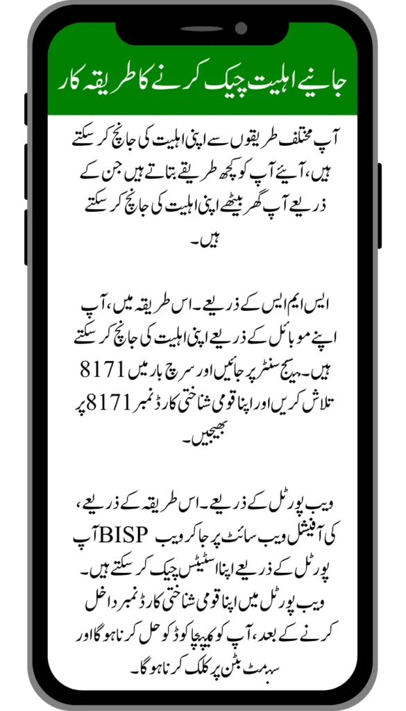 Through the web portal. Through this method, you can check your status through the web portal by going to the official website of BISP. After entering your national identity card number in the web portal, you have to solve the captcha code and click on the submit button.