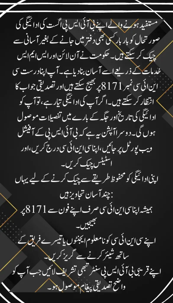 Beneficiaries can easily check their BISP August Payment status without visiting any office again and again. The government has made it simple through online and SMS services. You can send your valid CNIC number to 8171 and wait for the confirmation reply. If your payment is ready, you will receive details about the disbursement date and place. Another option is to visit the official BISP web portal, enter your CNIC, and check the status.