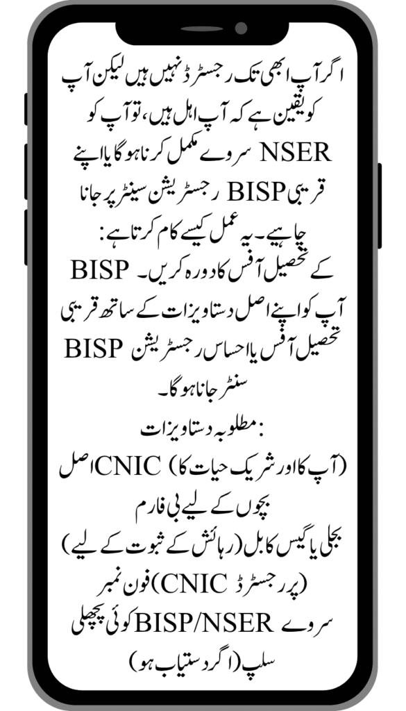 If you’re not yet registered but believe you’re eligible, you must complete the NSER survey or visit your nearest BISP registration center. Here’s how the process works:
