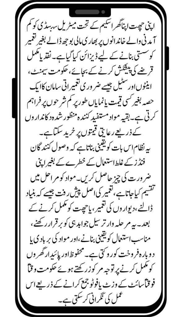 The Apni Chat Apna Ghar scheme is a government‑led housing initiative in Pakistan that helps low‑income families build simple, sturdy homes on their own land. It’s aimed at people who can’t afford full‑scale mortgages but need support to complete a basic roof over their heads. Rather than offering ready‑built homes, the program provides subsidized materials cement, bricks, steel allowing beneficiaries to self‑construct incrementally. Eligibility hinges on owning a small plot or having legal access to build. The program appeals to rural households and urban dwellers alike who wish to upgrade informal settlements into permanent residences.